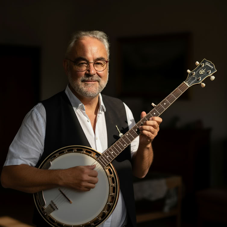 Neben dem 5-string Banjo „liebhändelt“ er mit Gitarre, Dobro, Harmonica und Uilleann Pipes, dem irischen Dudelsack. Als Rentner hat er jetzt viel Zeit für sein kleines Tonstudio, in dem er sich besonders auf akustische Musik spezialisiert hat.